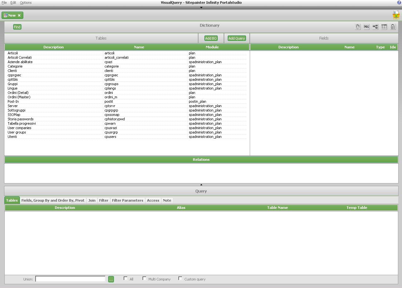 Nella zona Dictionary è presentato l'elenco delle tabelle (Tables), dei campi (Fields of...) e delle relazioni (Relations of...) che compongono il dizionario dati.