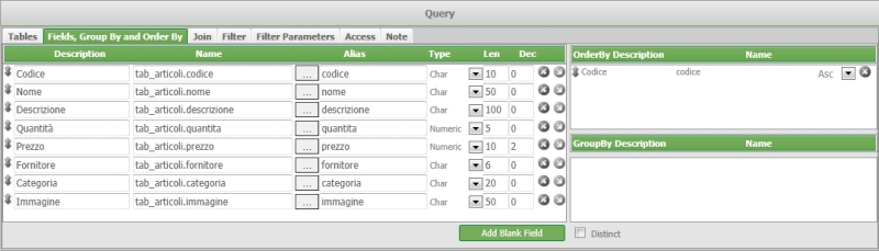 L'ordine con cui sono visualizzati i campi in questa sezione, è lo stesso che verrà utilizzato per la presentazione del risultato della query.
