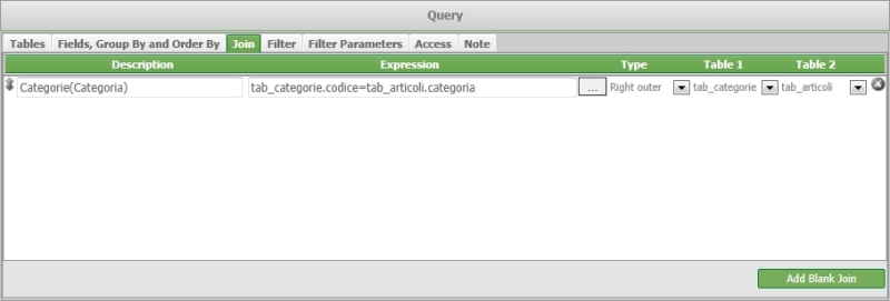 Nel caso non esista link tra due tabelle, č possibile inserire la Join manualmente cliccando sul bottone 'Add Blank Join', e digitando i nomi delle tabelle e dei campi coinvolti nella rispettive colonne.