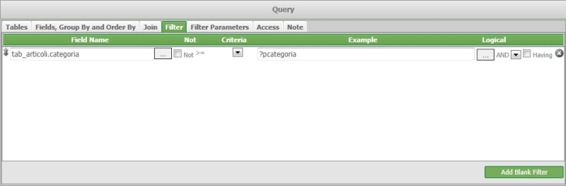Č possibile modificare l'ordine di presentazione delle espressioni utilizzando la funzionalitą di drag&drop con l'immagine che compare alla sinistra di 'Field Name'. L'eliminazione di una condizione si ottiene selezionando la "X" di fianco al flag 'Having'.