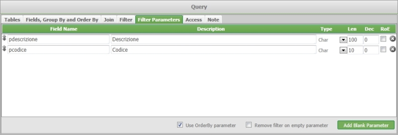 L'inserimento di parametri in questa zona comporta la creazione automatica di una maschera di richiesta parametri.