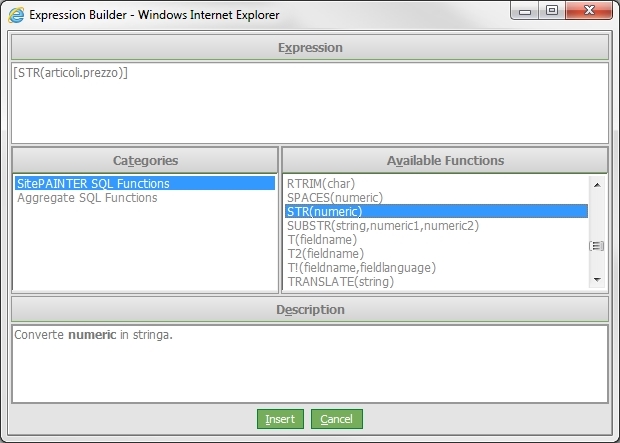 L'Expression Builder consente di scrivere espressioni aiutando lo sviluppatore con una serie di funzioni SQL che vengono poi tradotte nel dialetto del database utilizzato.