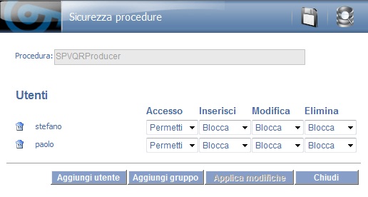 Nella precedente immagine la procedura SPVQRProducer è stata resa accessibile agli utenti "stefano" e "paolo". Stefano e Paolo sono utenti locali del server che fornisce i dati (in altre parole devono essere presenti nella lista degli utenti); inoltre Stefano e Paolo devono avere quantomeno l'accesso alle query che verranno invocate da remoto. Non è necessario che Stefano e Paolo siano utenti dei server remoti che leggono i dati.
