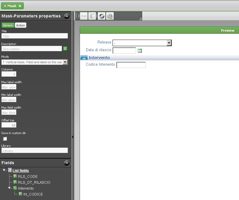 L'area di lavoro del Mask Parameters Editor è divisa in 3 parti: una parte per la definizione delle proprietà globali, una parte per la lista dei campi presenti e le loro proprietà e una parte che mostra un'anteprima della maschera realizzata.