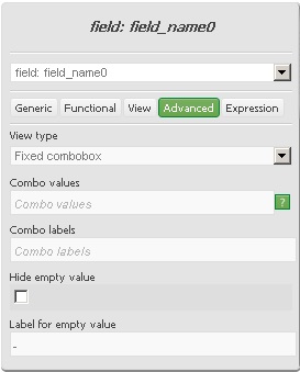 Le label e i corrispettivi valori delle opzioni della Combobox vengono definiti nelle proprietà 'Combo values' e 'Combo labels'.